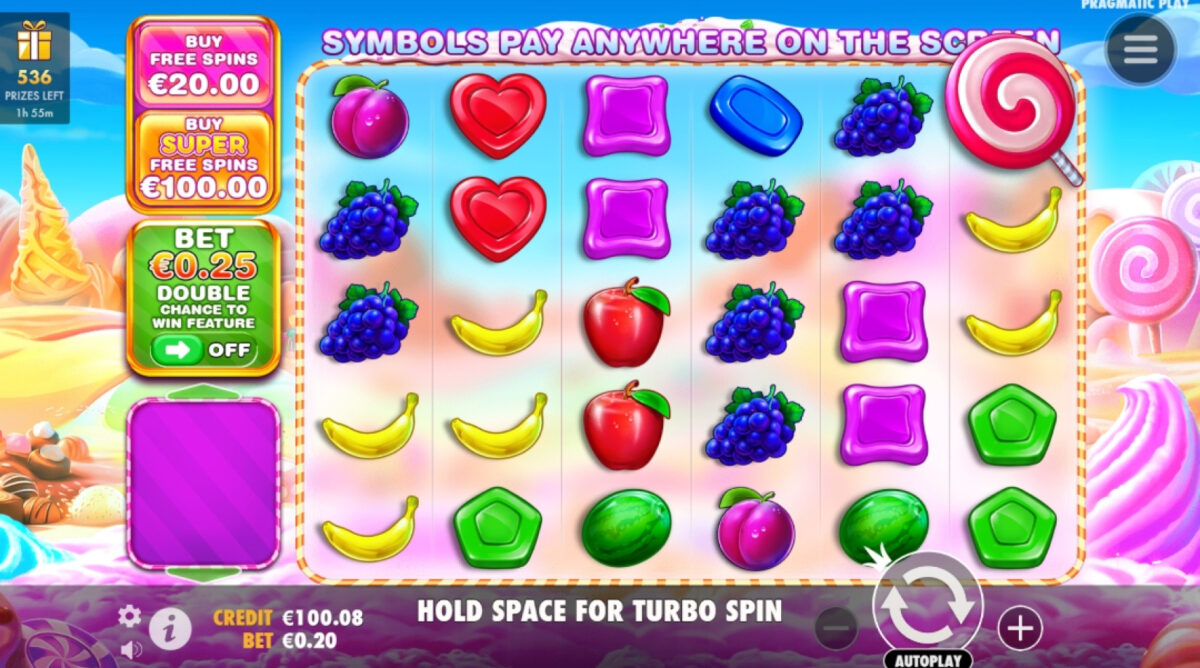 Das Spiel entführt Sie in eine fantasievolle und farbenfrohe Welt aus Süßigkeiten, saftigen Früchten und leuchtenden Explosionen. Statt klassischer Walzensymbole wie Zahlen oder Kartensymbole, wie man sie etwa von Book of Dead kennt, begegnen Ihnen Bonbons in verschiedenen Formen sowie Früchte wie Wassermelonen, Trauben, Pflaumen und Bananen. Diese bewusste Abkehr von traditionellen Casino-Motiven verleiht dem Spiel einen frischen Charakter und macht den Titel sofort wiedererkennbar.